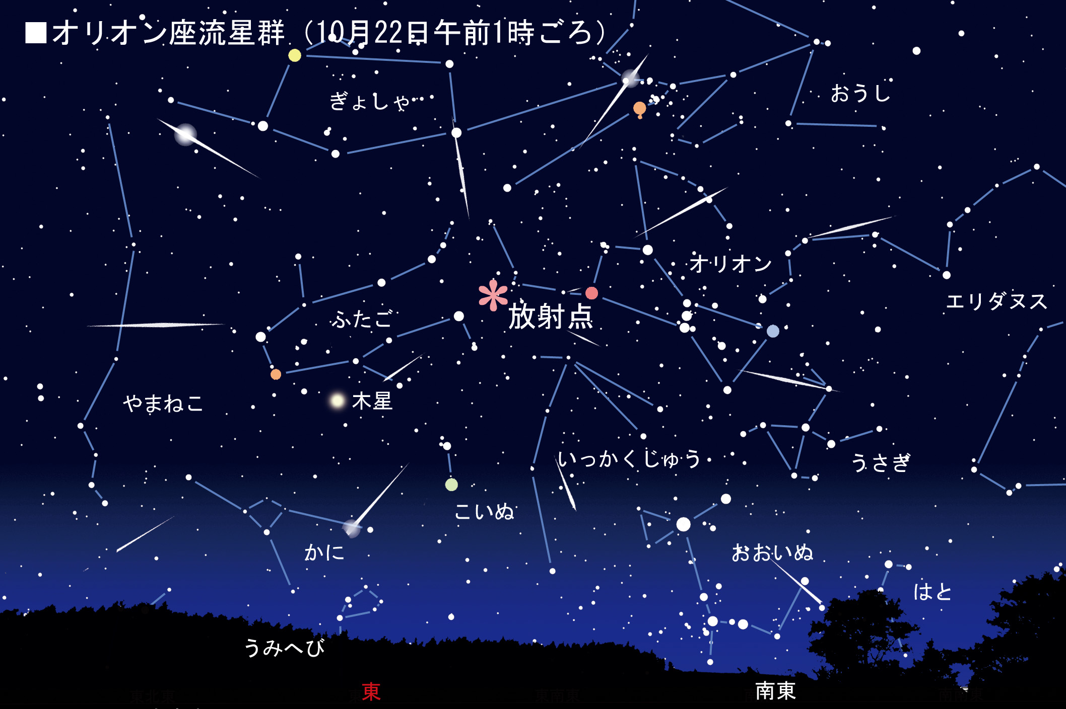 さて、今年のオリオン群の極大日の月齢は新月の29.3で、月明かりの全くない最高の条件で、放射点のあるオリオン座が東の空に昇る23時ごろから明け方まで観望することができる、願ってもない好条件となる。