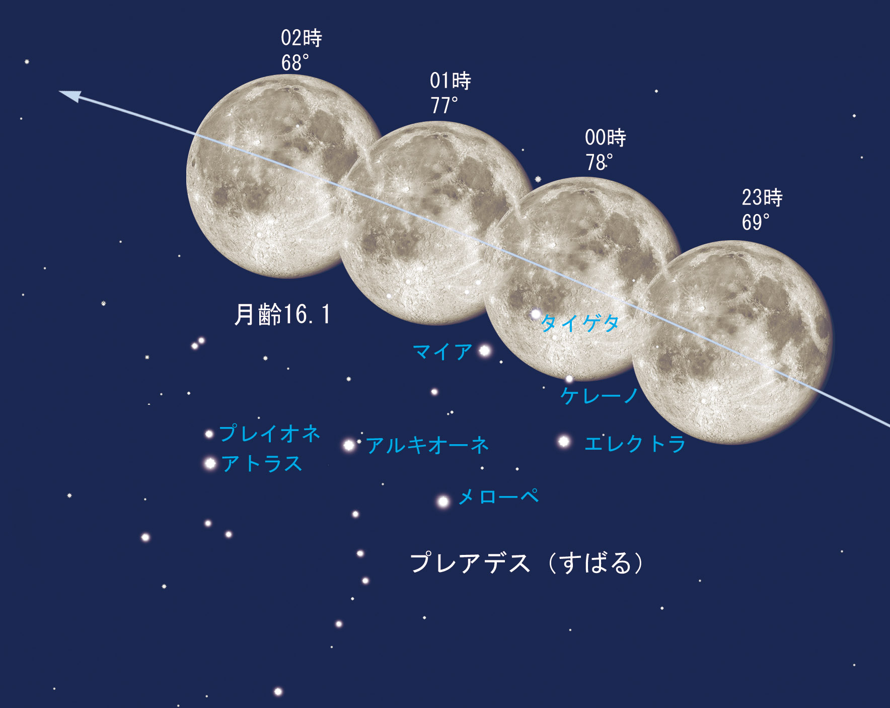 今回のプレアデス食は、月が南中するころに起こるので高度は十分だが、月がプレアデスの北寄りを通過することと、まぶしさに目がくらむほどの月齢16の月であることから決して好条件とはいえない。それでもプレアデスの星々は明るいので、双眼鏡や20倍以下の望遠鏡やスポッティングスコープ眺めていれば、満月がプレアデスにジワジワ近づいていくつかの星を隠しながら、月が西から東へ動きているゆくようすを楽しむことができるだろう。