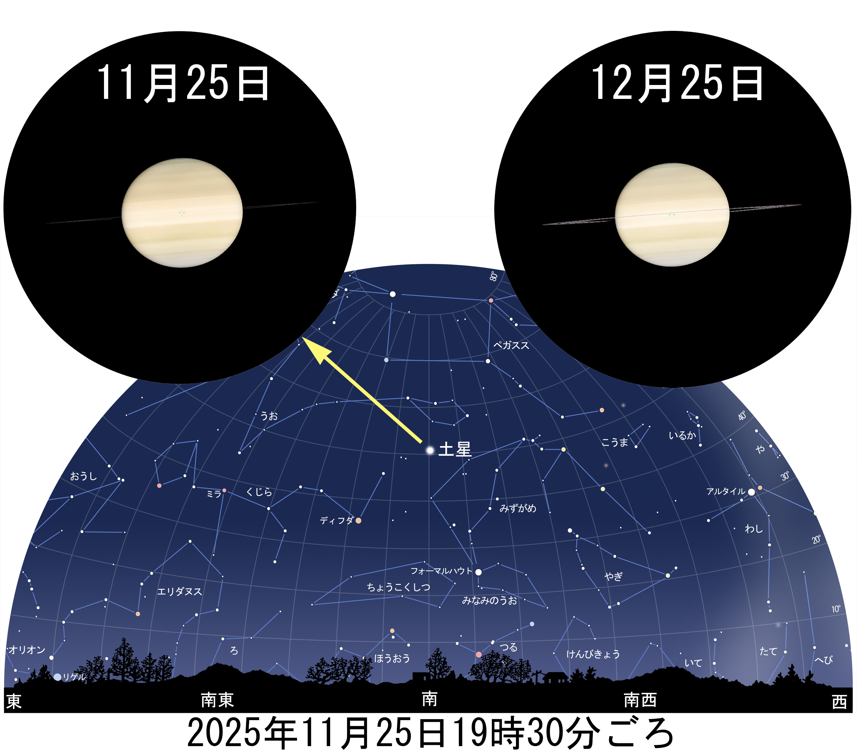 今回最後となる3回目のリングの消失は、11月25日ごろ、再び地球がリングをほぼ真横から見ることにより起こる。この時土星は宵の南の空に見え、リングのない土星を観望できる最高のチャンスとなる。リングがほとんど見えない状態は、11月中旬から12月上旬まで続く。その後少しずつリングの南面が見えるようになる。