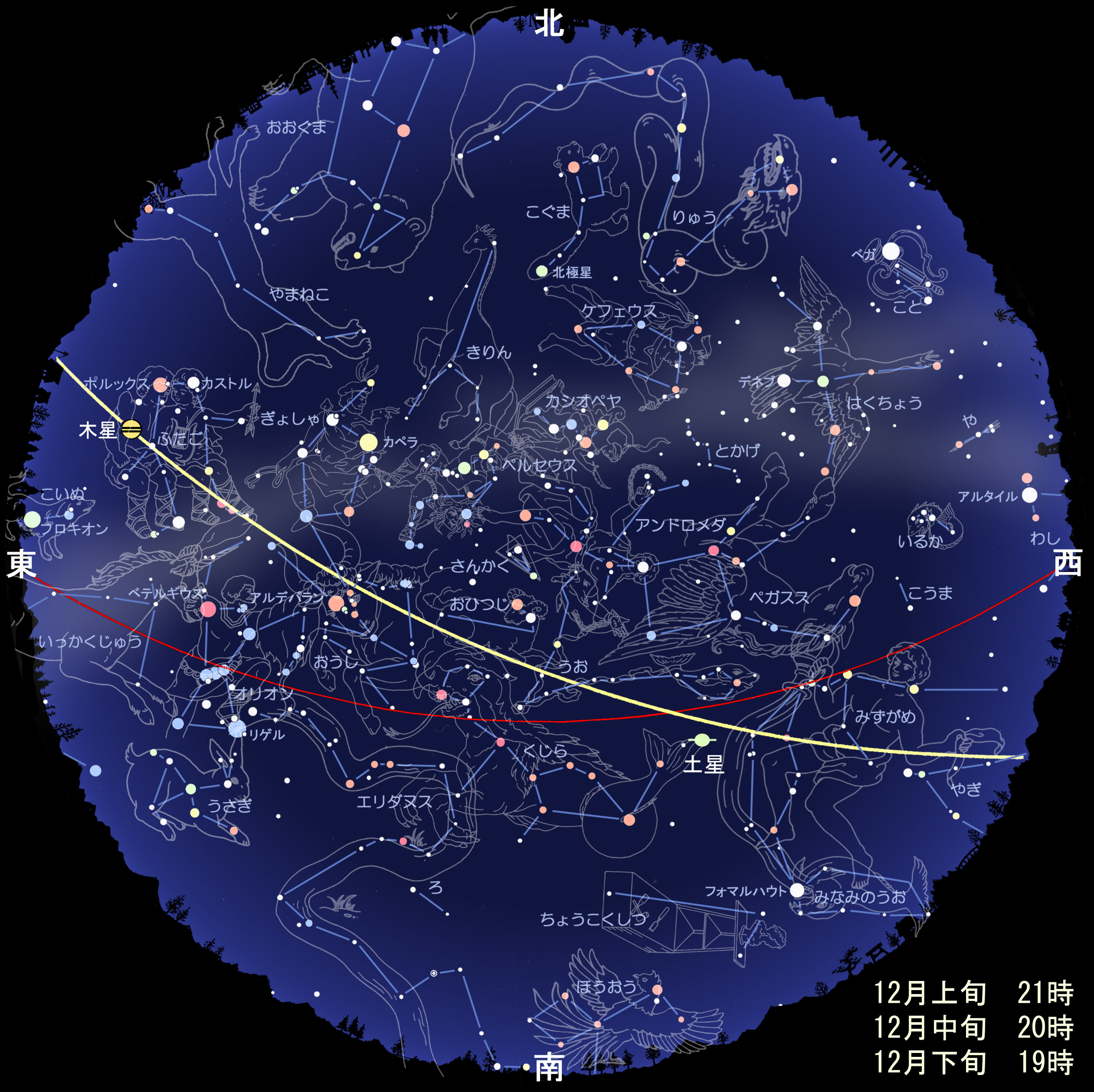 今年も残すところあと1ケ月になってしまった。木枯しが歩道の枯れ葉をカラカラと吹き飛ばし,靴音がせわしなくコツコツと響く12月。しかし星空はいつもと同じペースでゆっくりと冬の装いに替えて行く。12月の和名は「師走」。年の瀬となり忙しくなって、師匠といえども走り回るところから,付けられたというのが一般的だが,「年はつる月」「年はする月」が訛ったものだという説もある。いずれにしても「師走」と聞いただけで今年も終わりという思いがひたひたと押し寄せてくるから不思議だ。師走が終わると,また新しい年が巡ってくる。