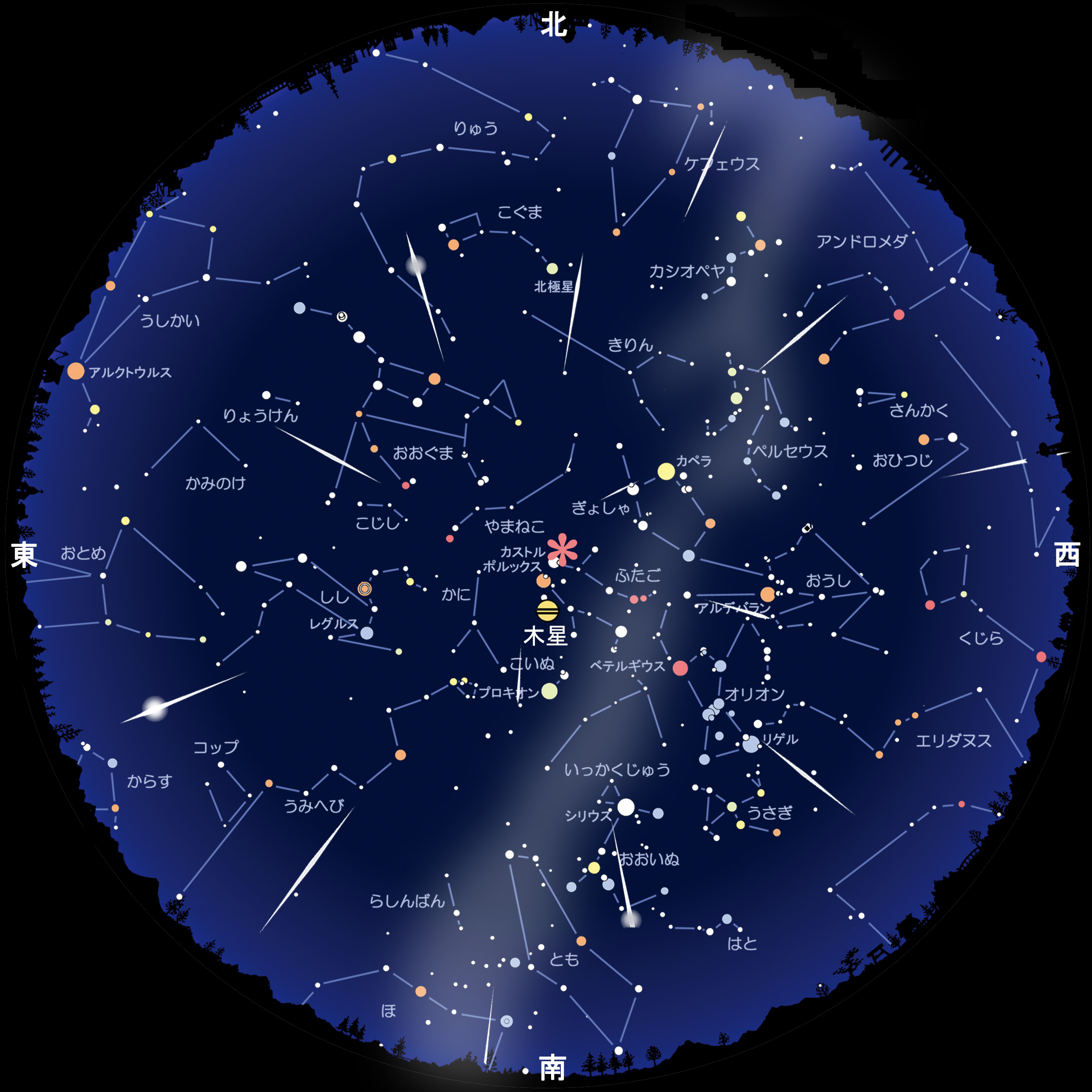 冬は透明度が良く暗い流星もよくわかるので、ぜひともこれらの座流星群を観望したい。夜が更けるにつれて気温がどんどん下がるので、防寒対策は十分に。